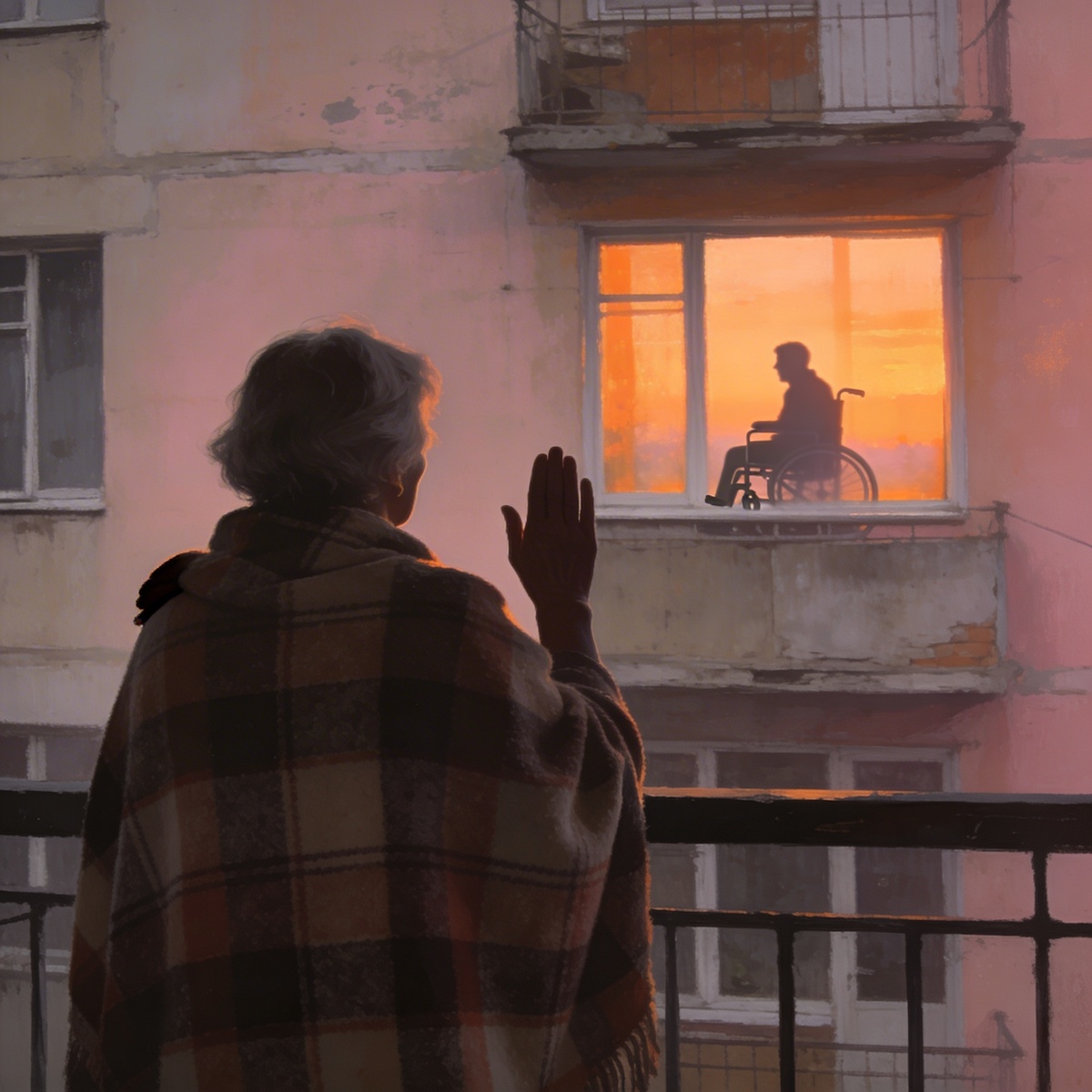 – Тридцать лет. В дождь, в снег, в минус двадцать. Она надевала тот плед клетчатый, выходила на балкон и махала. Он сидел у окна и ждал. Это было... как договор. Негласный. Она не спрашивала, как он. Он не жаловался. Просто — она махала, он видел. И этого хватало.