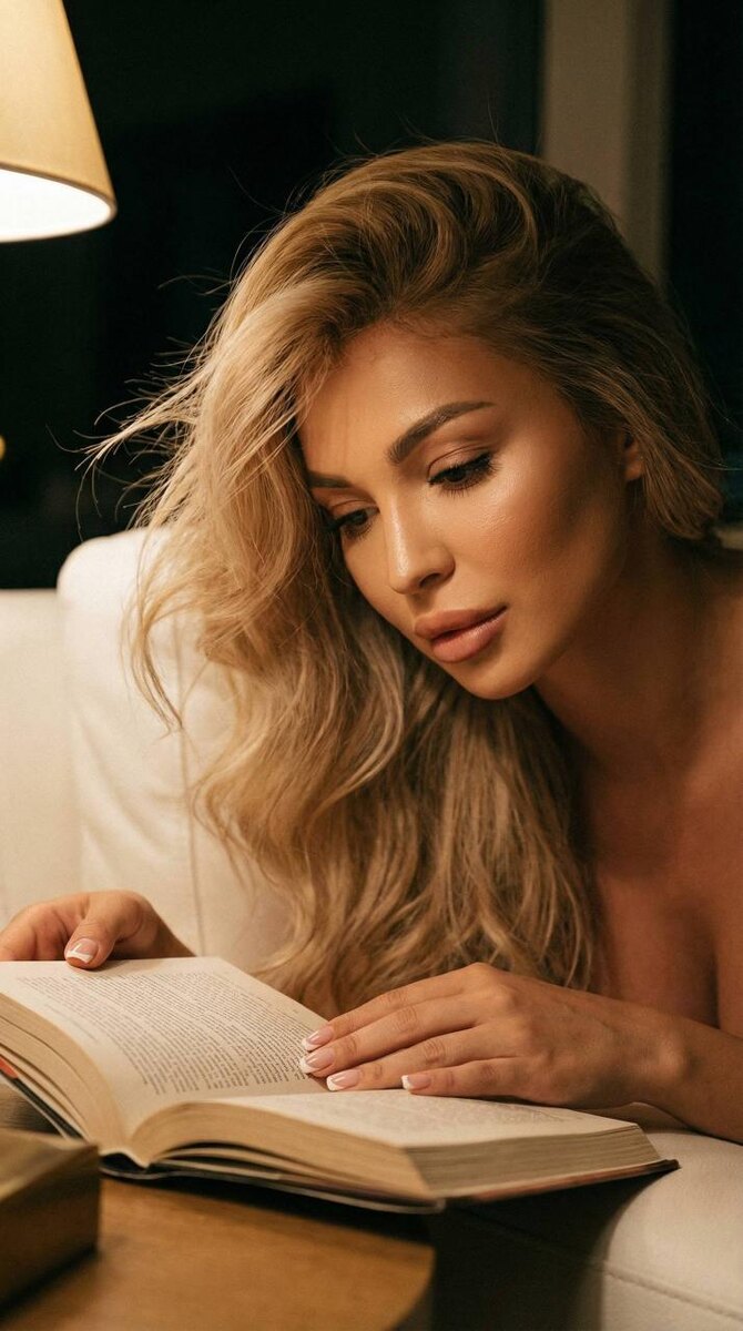 Модель: Nano Banana Сгенерировать🪄 Экстремально крупный план лица. Девушка лежит на белом диване. Ночь, свет от лампы Она смотрит в книгу Волосы объемные длинные блестящие частично падают на лицо от ветра Кинематографический эффект с добавлением зерна. Она лежит расслабленно Ногти френч Кожа идеальная подсвечена Не меняй черты лица