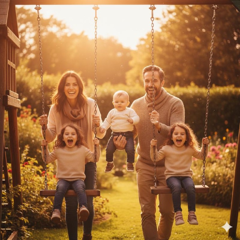 Сгенерировать фото🪄 Сохраняйте точные лица, черты лица, волосы, оттенок кожи с референсных изображений. Не генерируйте новых людей. Родители раскачивают детей на деревянных качелях в саду на закате. Движение запечатлено с лёгким размытием, радостные крики. Тёплый свет золотого часа, тени удлиняются. Ностальгическое детское беззаботное ощущение, естественные эмоции, композиция с движением. Референс персонажей, те же люди с референсных фото.