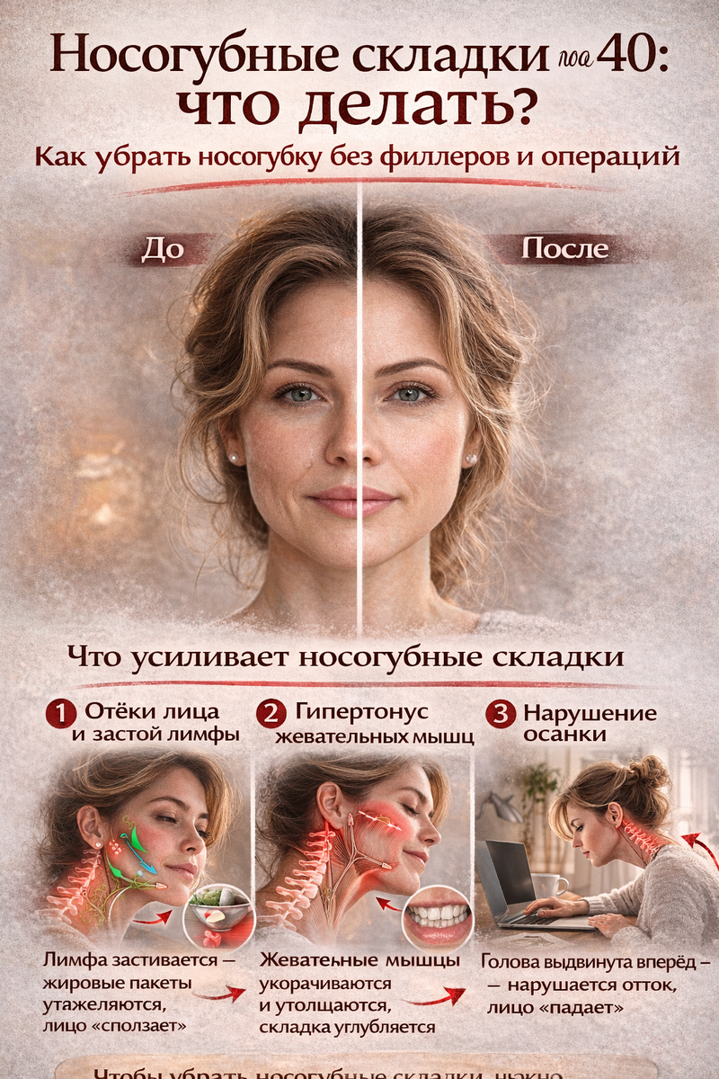 «Помогут ли филлеры от носогубки?» Но прежде чем решать, как убрать носогубные складки, важно понять — почему они появились. Читайте в статье Да, возрастные изменения играют роль: Но в 70% случаев выраженная носогубка — это не только возраст. Чаще всего причина глубже: То есть носогубные складки — это следствие, а не первопричина. Инъекции гиалуроновой кислоты действительно могут временно заполнить складку. Но если: то дополнительный объём может: Поэтому вопрос «как убрать носогубку» должен начинаться не с уколов, а с диагностики причины. 1. Отёки лица и застой лимфы Если лимфатическая система работает медленно, жидкость накапливается в средней трети лица. Жировые пакеты становятся тяжелее, ткани
