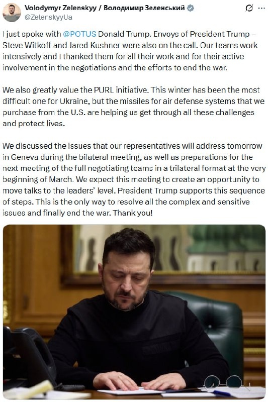 Zelensky CONFIRMS Trump call Mostly prep work for Geneva meetings — both bilateral and three-way talks 'at very beginning of March' He expects 'opportunity to move talks to LEADERS' level' soon