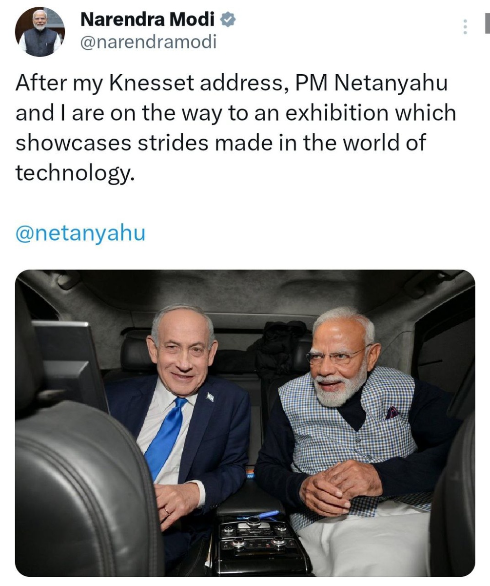 Smiling Modi and Netanyahu SHARE CAR on way to tech exhibition after Knesset speech