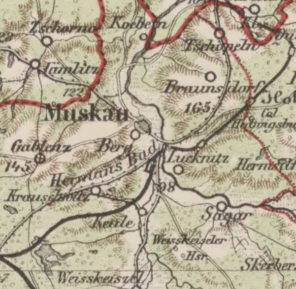 Сегодня поговорим о трех городах на линии Одер-Нейсе, которые после 1945 года стали разделенными, но с оговорками. Оговорки эти связаны с тем, что части, оставшиеся в Германии или доставшиеся Польше, исторически были предместьями этих городов, и вошли в их состав совсем незадолго до этого. Так, в 1940 г. в состав саксонского города Мускау было включено село Люкниц на правом берегу Нейсе (обозначалось Lucknitz, как на этой карте 1893 г. или Lugknitz). Оба топонима имеют славянское происхождение, на верхнелужицком Мускау – Mužakow. Кстати, самое время разместить карту диалектов лужицких языков – как видим, именно здесь распространены переходные говоры от верхне- к нижнелужицкому: Оказавшись в Польше, Люкниц был переименован в Любаницу, а с 1947 г. носит нынешнее название – Лэнкница (Łęknica). Статус города имеет с 1969 г. В свою очередь, в 1962 г. власти ГДР объявили Мускау курортом и переименовали его в Бад-Мускау. На спутниковой карте два города выглядят так: А Гугл-панорамы явили та
