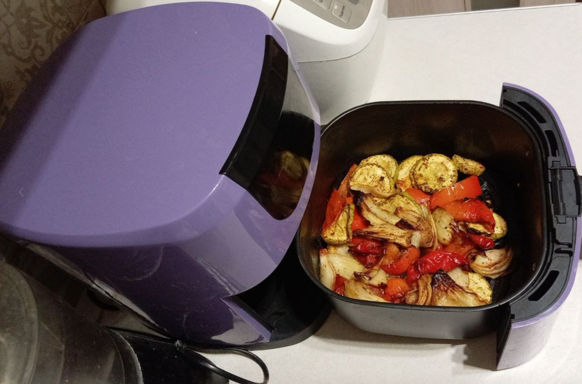 Овощи лучше встряхнуть пару раз, или перемешать, я перемешиваю силиконовой удобной лопаткой. Теперь я ставлю таймер на половину времени и по таймеру перемешиваю. Занимает ровно минуту, а еда стала выглядеть как из ресторана. Вот правда, все румяное, ничего клеклого.