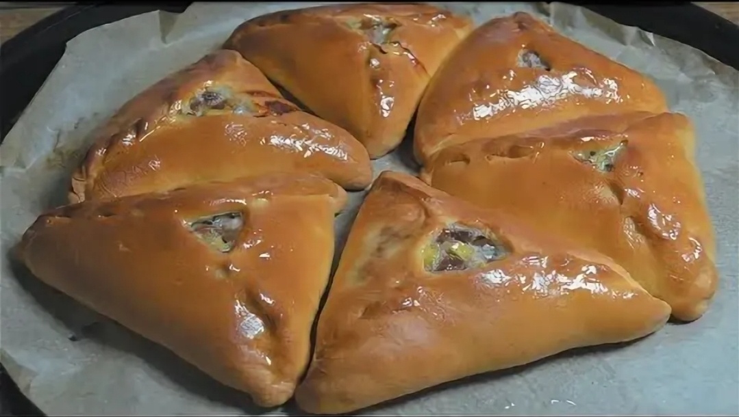 Противень застилаю пергаментом. Выкладываю треугольники швом вверх. Смазываю их взбитым желтком для румяной корочки. Отправляю в разогретую до 200 градусов духовку на 30-40 минут.