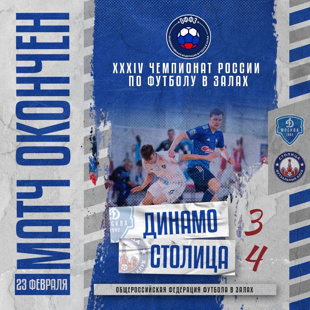 , упрочив свое лидерство в чемпионате. Динамовцы подошли к этому матчу в весьма ограниченном составе, более того в дебютном отрезке матча повреждение получил Роман Ксенофонтов. Первый забитый мяч случился на 9-ой минуте. Артём Исаков подхватив мяч на своей половине выдает идеальную передачу верхом через всю площадку на Павла Сучилина, который подрезает мяч над экс-вратарем «Столичных» Павлом Николаевым. Ещё через минуту размашистая веерная комбинация: Сучилин отдает на пяточек в касание и Владимир Гончаров прошивает голкипера снова. Буквально на этой же минуте «Столица» забивает третий мяч. Максим Гагуев вводит точно на Игоря Коротаева, тот моментально находит впереди убегающего Андрея Иванова, и опять элегантная подрезка мяча над руками голкипера - 3:0! Казалось, что после такого отрезка «Динамо» будет трудно оправится, но они нашли в себе силы и в конце тайма сократили разрыв в счете - после ошибки в обороне, мяч в ворота «столичных» отправил Матвей Осыко. Ответ гостей себя ждать н