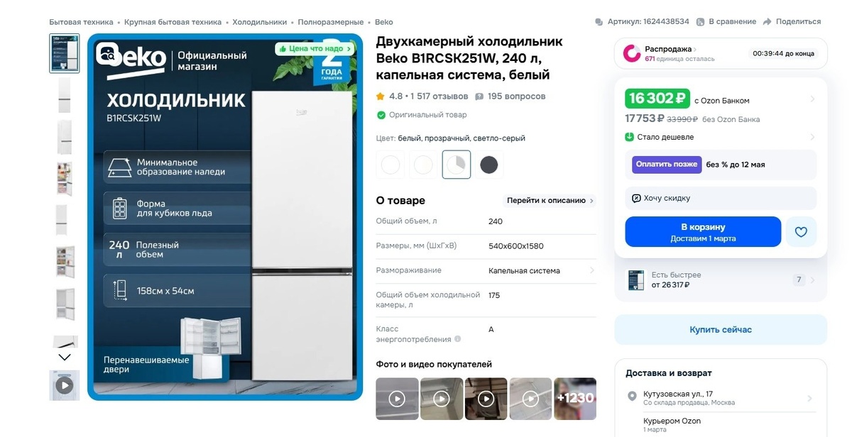 https://www.ozon.ru/product/dvuhkamernyy-holodilnik-beko-b1rcsk251w-240-l-kapelnaya-sistema-belyy-1624438534/ #Промокоды #Купоны #Акции #Скидки #Озон #WB #Wildberries #Ozon