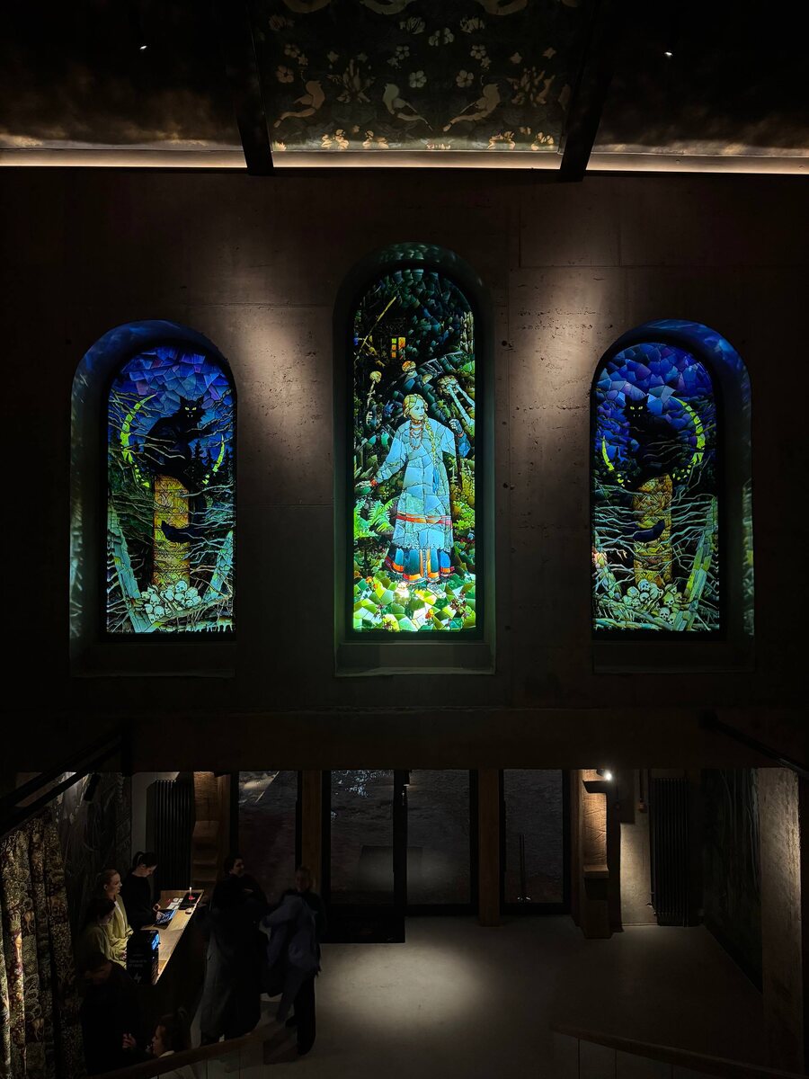 Побывала одной из первых в новом Горыныч в ЖК Lucky. Проект получился масштабным и эффектным, но при этом не перегруженным. Атмосфера немного сказочная, как будто попадаешь в современную версию русской избы, только в формате большого городского ресторана. Над входом — витраж с Василисой Прекрасной. Вечером он красиво подсвечивается и выглядит почти театрально, а днём зал заливает естественный свет. Пространство большое, с высокими потолками, множеством деталей, которые хочется разглядывать. Даже в уборных краны сделаны в виде лебедей. Видно, что над интерьером работали внимательно и с фантазией. Теперь к еде. Сразу бросается в глаза печь для пиццы, которая готовит её буквально за полторы минуты. Есть и хоспер для стейков — мясо получается сочным и с правильной текстурой. В целом меню понятное, без лишней экзотики, но исполнение на уровне. Тар-тар из говядины доели до последней крошки. Хорошая текстура, баланс специй, без лишней тяжести. Цезарь с креветками приятно удивил: много зелен