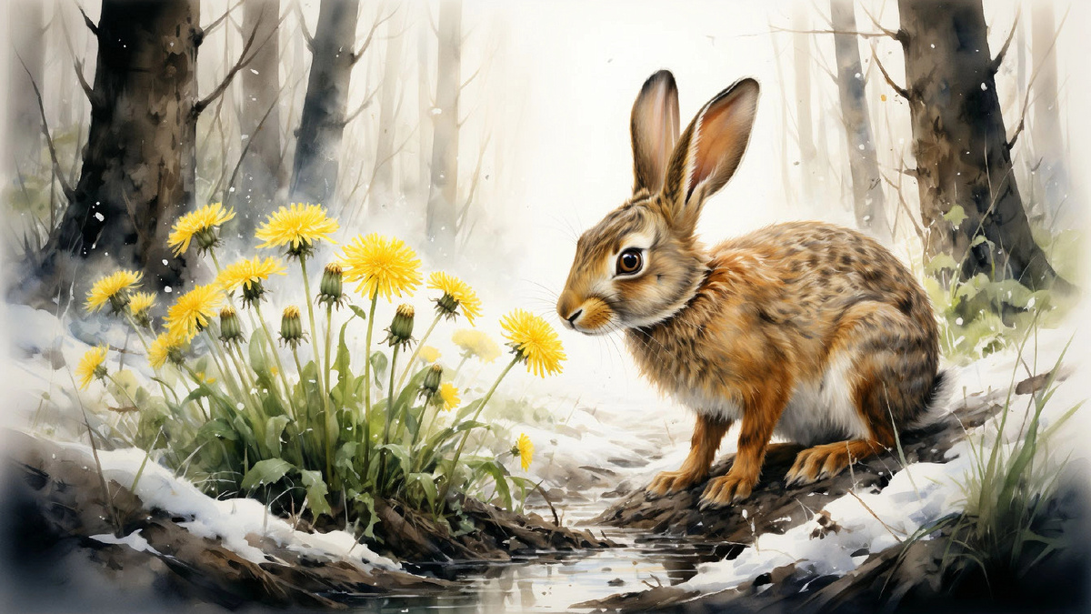 В одном лесу, под старой елью с мохнатыми лапами, жил маленький зайчонок Пушок. Всю зиму он просидел в тёплой норке, грел ушки и слушал, как ветер воет за стеной. Ему очень нравилось, когда мама приносила сухую траву и рассказывала сказки. Но иногда он подходил к выходу из норки, смотрел на белую стену снега и спрашивал: — Мама, а когда уже будет весна? Мама-зайчиха улыбалась: