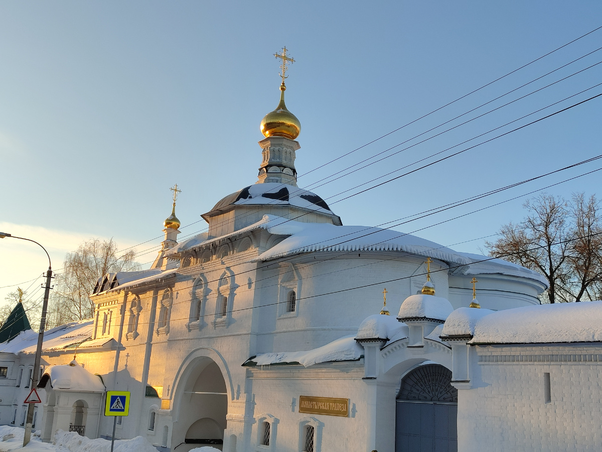 Мы подъехали к обители с южной стороны. Так сложилось, что в южном прясле помимо Святых врат есть ещё одни передние ворота. Эта зима настолько одарила нас снегом, что гулять по тропкам вокруг монастыря, чтобы посмотреть в том числе и на задние (северные) ворота, хоть и интересно, но довольно проблематично. Поэтому мы поспешили пройти на территорию. Именно со Святых врат в монастыре началось каменное строительство. В их нижнем ярусе, возведённом в 1672 году, были устроены пекарня и сводчатые чуланы. Насколько же непредсказуемы переплетения исторических событий: мы входим в обитель с улицы, носящей в наши дни название Большевистская.