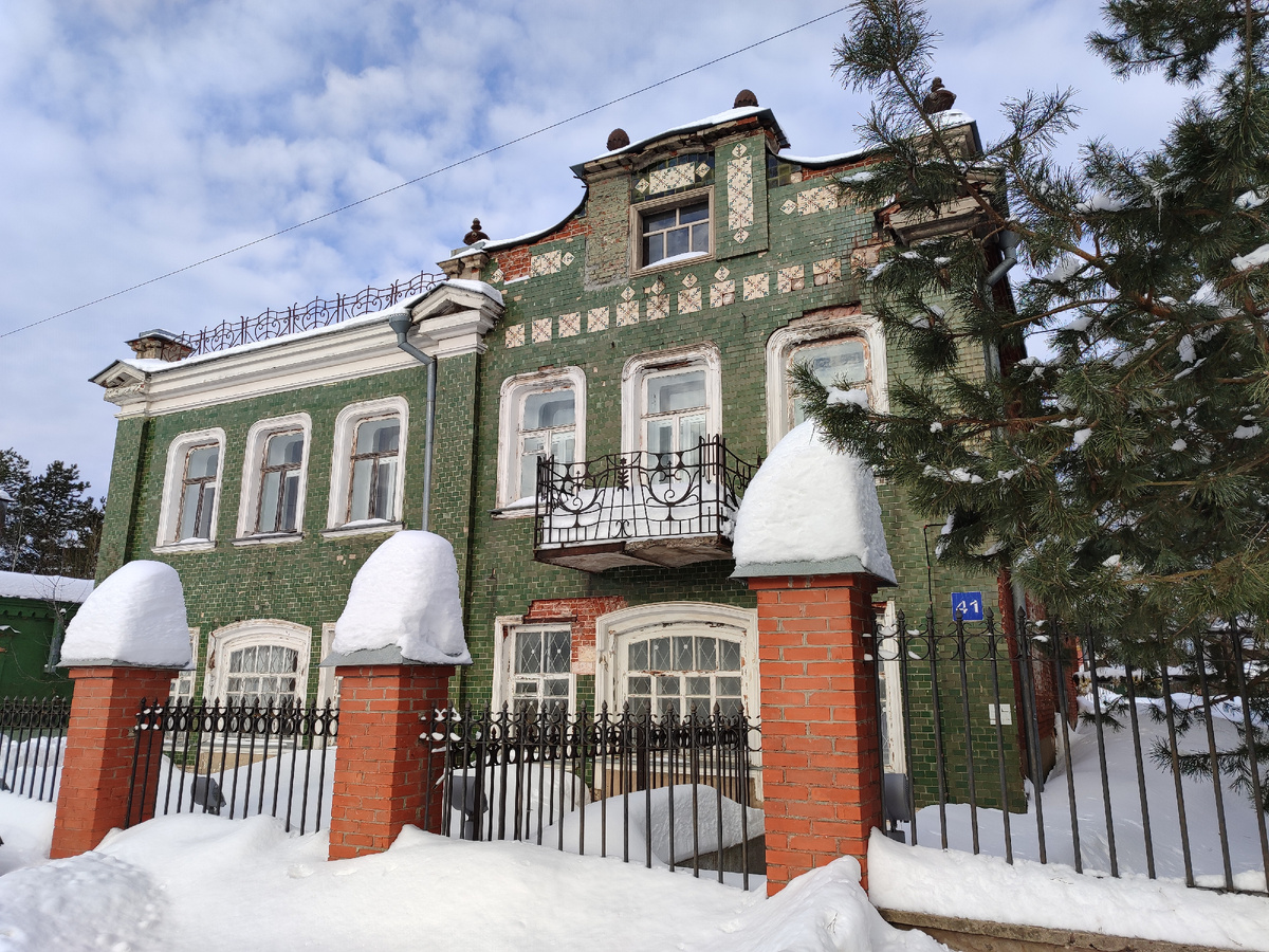 Но начнём с дома. Перед нами особняк купца первой гильдии, почётного гражданина Талдома, старообрядца Дмитрия Ивановича Волкова, торговавшего обувью и кожаными изделиями. Строительство его началось в конце XIX века. Мастеров наняли в Кашине. К 1914 году здание обрело форму в стиле ар-нуво: сдержанно-зелёный цвет, облицованный керамической плиткой фасад, асимметрия, плавно изогнутые формы. Для потолков и балконов использовались железобетонные конструкции Монье. Основу балконов составляли выносные плиты без видимых опор. Потолки в доме сделали сводчатыми и арочными, плавно переходящими в стены, украсив их лепниной с растительными мотивами.