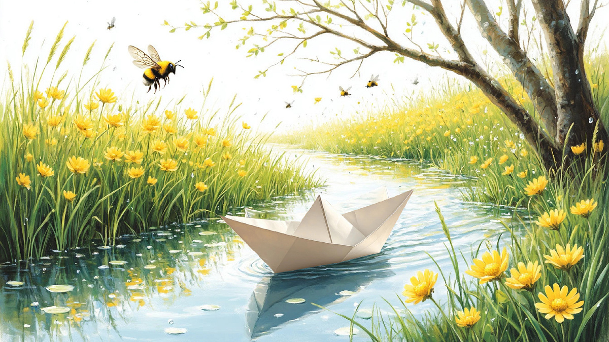 — Ты же бумажный. Размокнешь и утонешь. Но кораблик не верил им. Каждое утро он смотрел в окно и видел, как за стеклом что-то меняется. С крыш падали капли, на дорогах появлялись лужи, а по асфальту бежали весёлые ручьи. — Это весна, — сказала старая книга на полке. — Самое время для путешествий. Однажды утром Петя открыл окно, чтобы проветрить комнату. Тёплый влажный ветер ворвался внутрь, подхватил Кораблик и… вынес его на подоконник! Кораблик кубарем покатился по мокрому стеклу и — плюх! — упал прямо в большую лужу под окном. Сначала он испугался. Вода была холодной и сразу начала пропитывать его бумажное дно. Но вдруг он почувствовал, что движется. Лужа не стояла на