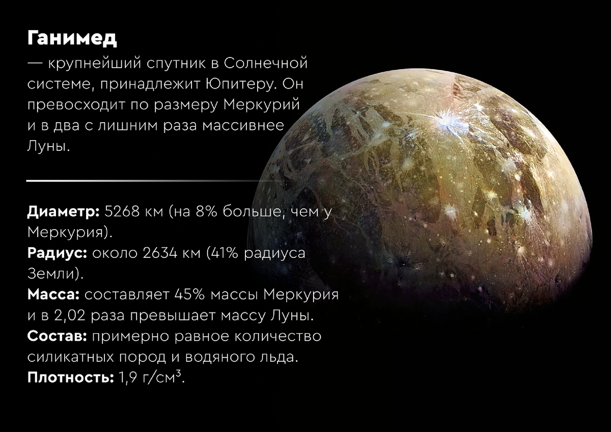 Знаете ли вы, что Ганимед больше Меркурия? При диаметре 5270 км он является бесспорным рекордсменом среди всех спутников в Солнечной системе. Если бы он обращался не вокруг Юпитера, а вокруг Солнца, мы бы без колебаний назвали его полноценной планетой.