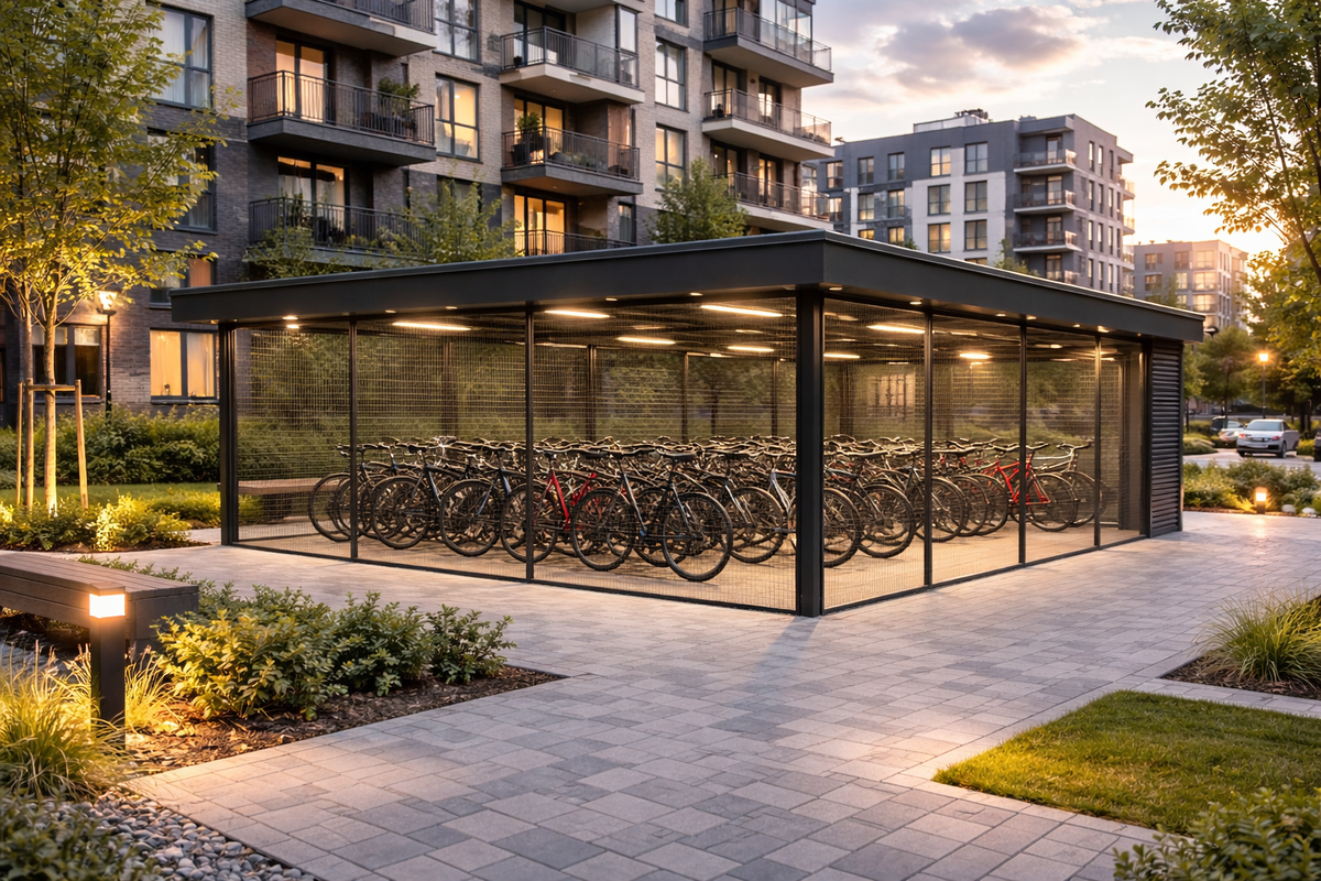 Второй — общий велобокс (велокомната, велопарковочный модуль): закрытое помещение или отдельностоящая конструкция, внутри которой расположены велокрюки, стойки или горизонтальные направляющие. Доступ контролируется одним общим замком, домофоном или магнитной картой. Именно этот формат чаще всего встречается в российских новостройках эконом- и комфорт-класса.