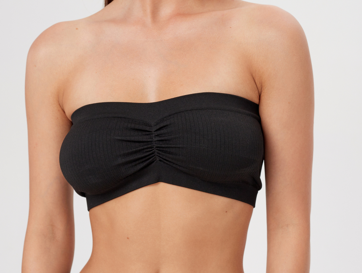 Бретели в бандо отсутствуют (хотя могут быть дополнительным аксессуаром), крепление осуществляется как спереди, так и сзади, а в случае использования эластичных материалов можно обойтись вообще без завязок.
