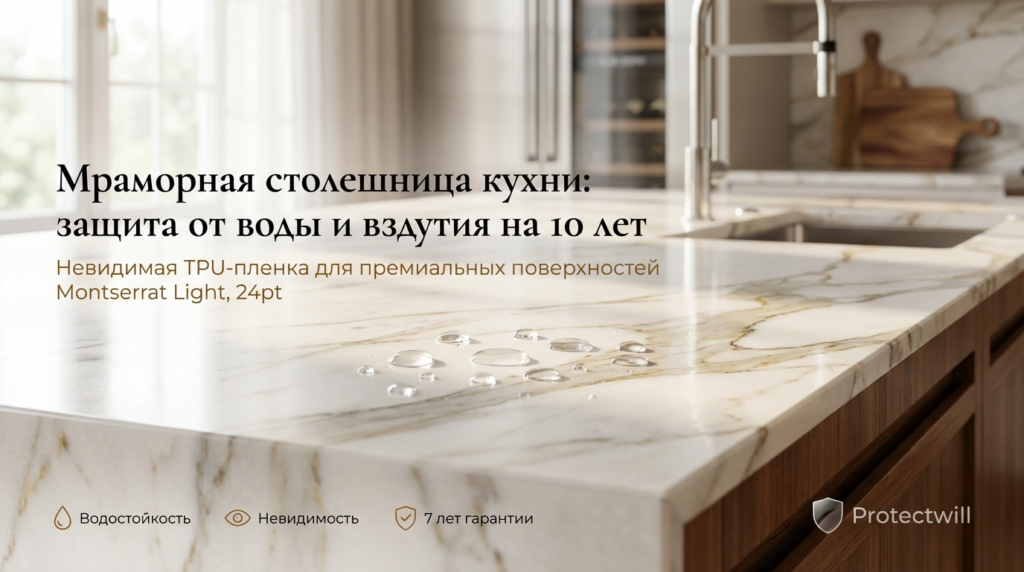 Показатель Без защиты (риск замены) С защитой Protectwill Стоимость решения 120 000 – 450 000 ₽ (замена столешницы) ~25 000 ₽ (оклейка зоны) Влагостойкость Зависит от целостности лака (снижается со временем) 100% (Абсолютная). Полиуретан не имеет пор. Срок службы Первые вздутия через 12–18 месяцев 7–10 лет (Гарантия на материал) Термостойкость Лак мутнеет от горячей чашки До +120°C. Выдержит кипяток. Внешний вид Царапины и потертости неизбежны Self-healing (самовосстановление царапин)