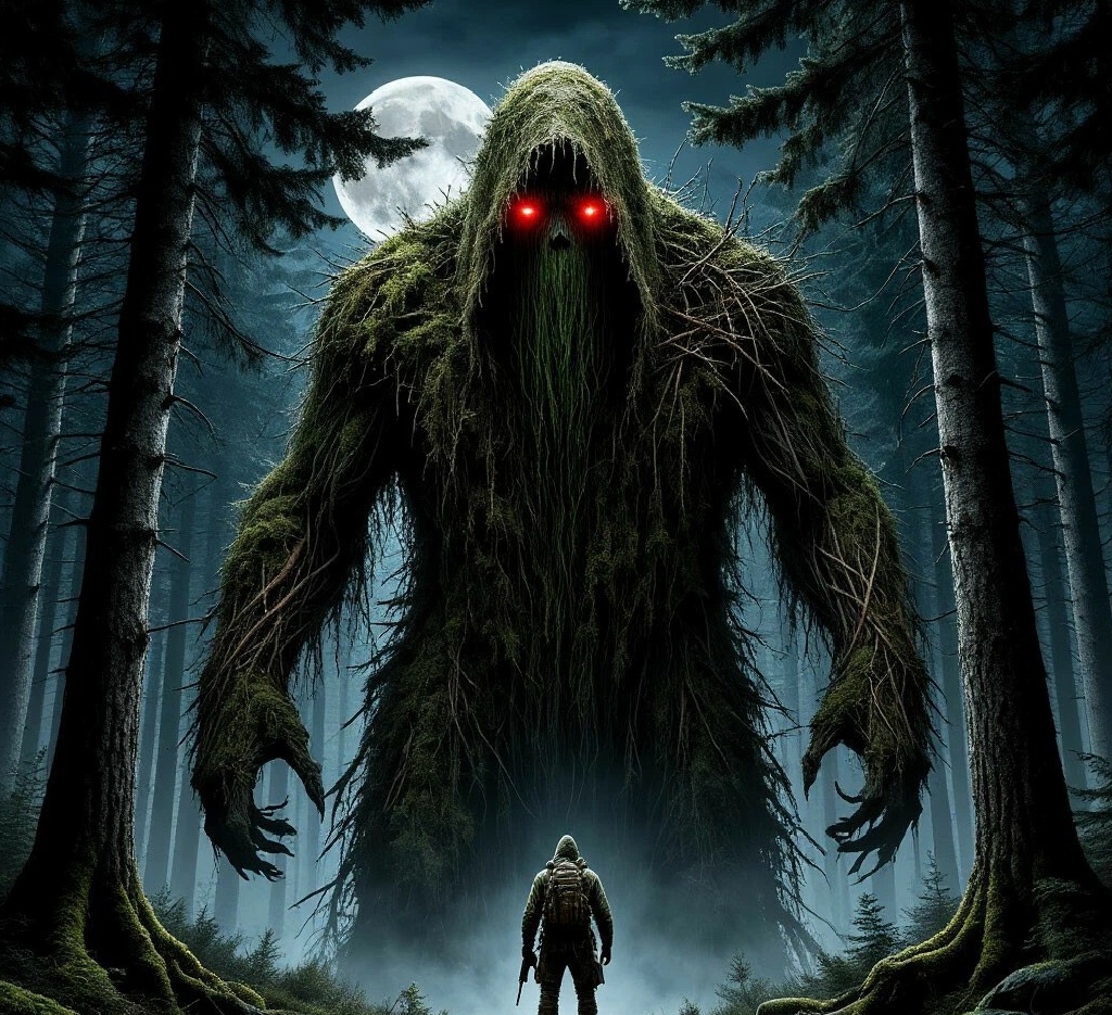 Высокий — Михаил прикинул про себя, никак не меньше двух с половиной метров, а то и все три. Широкий в плечах, будто медведь, поднявшийся на задние лапы. Одежда его была сшита непонятно из чего — то ли звериные шкуры, то ли мох с еловым лапником, сплетённые воедино. Голову покрывала шапка из меха, какого никто из них прежде не видывал. Но самое страшное было лицо. Из-под густого волосяного покрова, закрывавшего почти всё, горели два глаза — маленькие, чёрные, с красными полукружьями в глубине, будто там тлели угли. Носа и губ не было видно, лишь тёмный провал там, где должен быть рот.