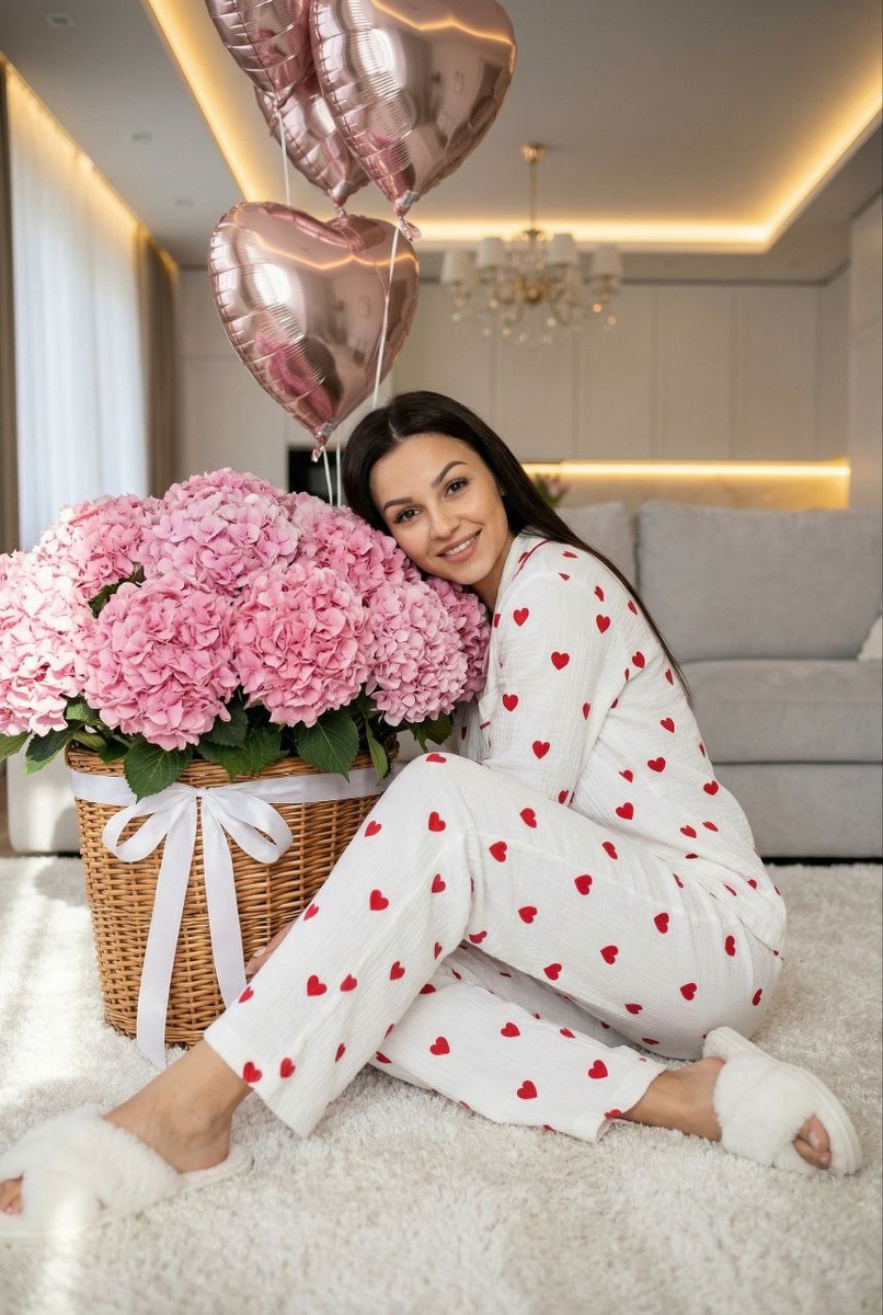 : С праздником всех💋 Create a close-up (without changing facial features): a modern, elegant living room in light tones. A woman in white muslin pajamas with numerous red hearts sits sideways on a white fluffy carpet. Her hair is parted in the center and she wears white fluffy slippers. On the left is a huge bouquet of 1000 dense pink hydrangeas in a wicker basket with a white ribbon. Above are several foil heart-shaped balloons. Interior: a light, gray sofa behind the woman, warm ceiling lighting, a chandelier in the ceiling. Lighting: soft daylight from the left + warm LED accent. Shallow depth of field, detailed texture of fabric, petals, and foil. Style: luxury interior photography, ultra-detail, 4K, 35mm, f/2.0–2.8, ISO 100, no text or watermarks, the girl's eyes are open and she is smiling. Light natural makeup, false eyelashes, nude lips Поддержим реакцией 🤩