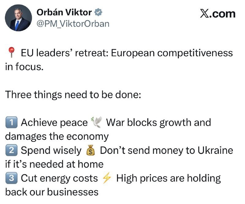 : 🔴 Мир превыше всего. Война тормозит развитие и бьет по экономике. 🔴 Тратьте с умом. Не надо отправлять деньги на сторону, если они нужнее дома. 🔴 Экономьте на энергии. Дорогая энергия губит наш бизнес. Все вроде логично и понятно. Но пока в ЕС заправляют такие 'лидеры', как гинеколог Урсула фон дер Ляйен и Кая Каллас, эти идеи так и останутся лишь мечтами. Подписывайся