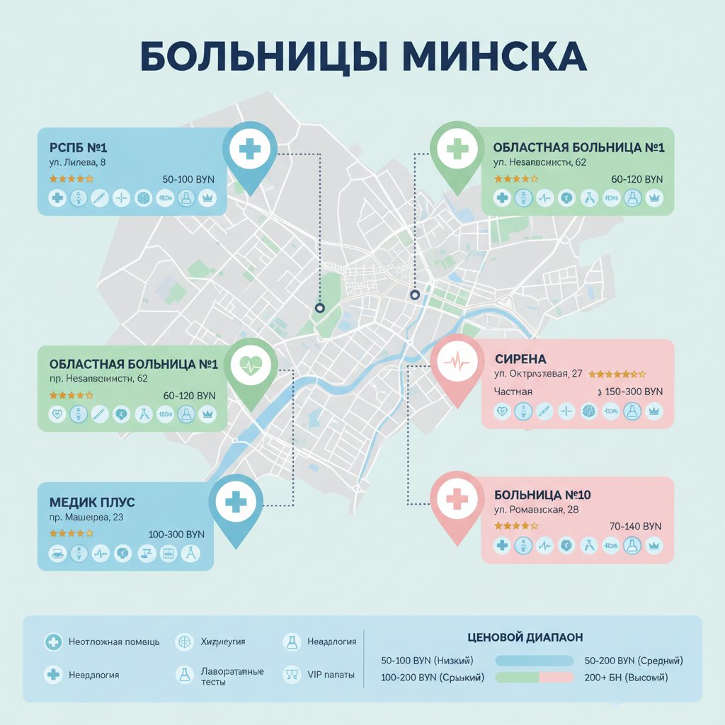Минск — город, где можно хорошо получить медицинскую помощь. Есть государственные больницы (бесплатно или дёшево). Есть частные больницы (дорого, но быстро и комфортно). Я собрал информацию про 6 главных больниц Минска: отделения, врачи, услуги, цены, палаты, рейтинги, отзывы, адреса, как доехать. Это честный разбор на основе отзывов на 2ГИС, Яндекс-Карты и опыта людей, которые там лежали.