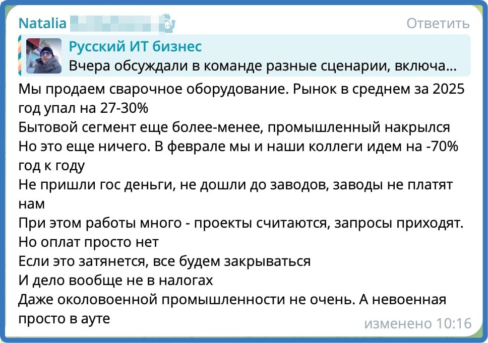 А где его взять? Ну, если смотреть на вещи филосовски, то мы летим на камушке (Земля) вращаясь вокруг Солнца, в неизведанные ебеня... Это все ясно и понятно. Но тут у ребят -70% на продаже сварочного оборудования год к году. У нас в 2024 году выручка итоговая была около 140 млн, а в 2025, по памяти пишу, около 80 млн. летим в ебеня :) Русский ИТ бизнес