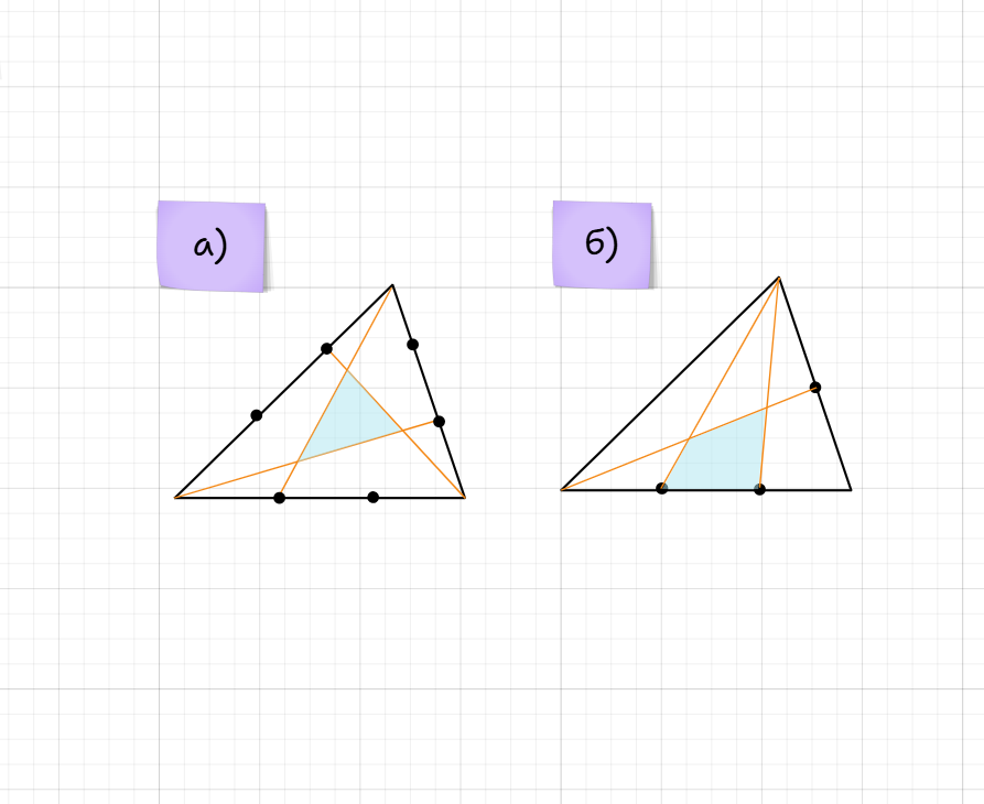 16. ★★☆ Каждую сторону треугольника разбили на равные части. Какую часть его площади составляют площади закрашенной фигуры на рисунках? Идея решения а) ...