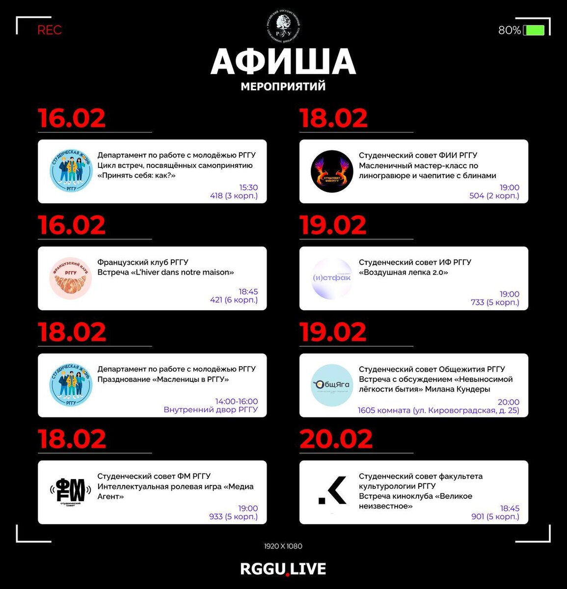 📢 Департамент по работе с молодёжью РГГУ приглашает студентов на цикл встреч, посвящённых самопринятию «Принять себя: как?» 📌 16.02/ 15:30/ 418 (3 корп.) Подробнее здесь 👈 📢 Французский клуб РГГУ ждёт на встрече «L'hiver dans notre maison» 📌 16.02/ 18:45/ 421 (6 корп.) Подробнее здесь 👈 📢 Департамент по работе с молодёжью РГГУ устраивает празднование «Масленицы в РГГУ» 📌 18.02/ 14:00-16:00/ Внутренний двор РГГУ Подробнее здесь 👈 📢 Студенческий совет ФМ РГГУ предлагает принять участие в интеллектуальной ролевой игре «Медиа Агент» 📌 18.02/ 19:00/ 933 (5 корп.) Подробнее здесь 👈 📢 Студенческий совет ФИИ РГГУ организует масленичный мастер-класс по линогравюре и чаепитие с блинами 📌 18.02/ 19:00/ 504 (2 корп.) Подробнее здесь 👈 📢 Студенческий совет исторического факультета РГГУ приглашает на «Воздушную лепку 2.0» 📌 19.02/ 19:00/ 733 (5 корп.) Подробнее здесь 👈 📢 Студенческий совет Общежития РГГУ проводит встречу, где обсуждается «Невыносимая лёгкость бытия» Милана К