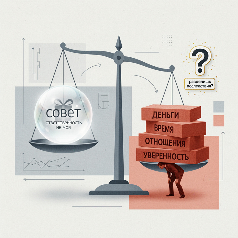 Ты послушался. Всё пошло не так. И теперь вопрос: кто за это ответит? Тот, кто советовал, скажет: «Я же хотел как лучше». Или: «Ты сам так решил». Или вообще исчезнет из диалога. А платить будешь ты. Потому что последствия – всегда на том, кто действует. Не на том, кто говорит. Это важная вещь. Люди легко раздают директивы. «Делай вот так. Только так и выйдет». Но когда результат оказывается провальным, они не несут цену. Ты несёшь. Ты теряешь деньги. Отношения. Время. Уверенность в себе. А тот, кто «помог советом», продолжает жить как жил. Что самое интересное если получится, то за совет потребуют долю, потому, что это была их идея. И это тоже нужно учитывать. Поэтому каждый раз, когда кто-то говорит тебе «как надо», задай вопрос: «А ты разделишь последствия? Если нет – это не совет. Это перекладывание ответственности. Человек, который реально хочет помочь, не давит. Он спрашивает: «Что ты сам думаешь? Что ты чувствуешь? Что тебе важно?» А тот, кто навязывает, просто снимает