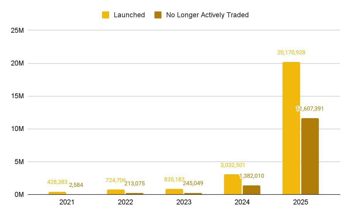 Посмотрите на график 👆 Из 20,2 млн токенов, которые были запущенны за прошлый год (желтый столбец), около 11,6 млн уже перестали активно торговаться (коричневый столбец). Капитал перераспределяется в сторону более стабильных и фундаментальных активов. Что, ребята, я вам весь прошлый год говорил на открытых вебинарах, что альткойны не только опасны, но и никакого альтсезона не будет. А кто призывает к альткйонам и мемконам — просто не разбирается в этом рынке.