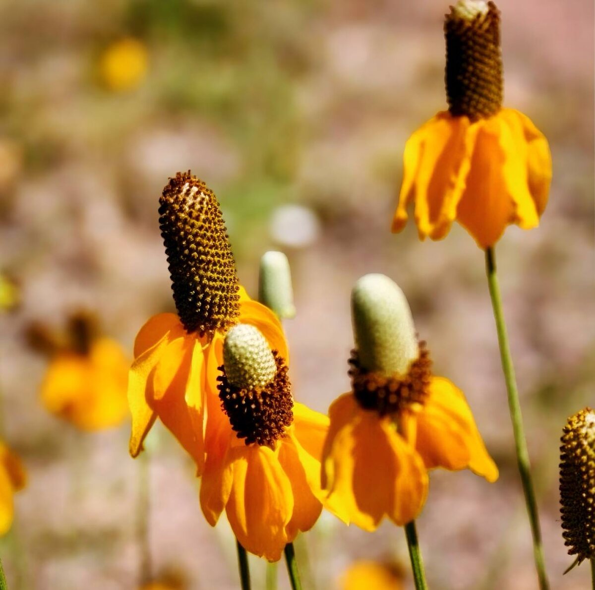 ’ (Ratibida columnifera ‘Cheyenne Yellow’) Яркий сорт с чисто-жёлтыми поникающими лепестками и выразительным вытянутым тёмно-коричневым конусом. Формирует прочные прямостоячие стебли высотой 60–100 см, образуя лёгкий, воздушный куст с ажурной серо-зелёной листвой. Цветёт обильно и продолжительно — с начала лета до осени. Предпочитает солнечные участки и хорошо дренированные почвы, отличается высокой засухоустойчивостью и неприхотливостью. Идеально подходит для природных садов, прерийных композиций и массивных посадок в цветниках. Отлично сочетается со злаками, эхинацеей и рудбекией. Подходит для срезки — в вазе сохраняет декоративность до 7–10 дней.