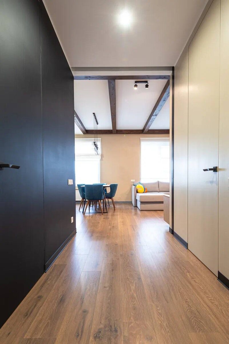 Здесь у нас конструкция из двух створок, которые уходят в заранее подготовленный пенал — в открытом состоянии кажется, что перегородки просто нет. Стекло с плёнкой Oracal: створки закрыты, свет не проходит, и зона становится максимально отделённой от общего пространства. А ворсистый уплотнитель между створками шумоизолирует и не пропускает запахи. ✅Перегородка разделяет прихожую и большую кухню-гостиную. Вот такое нестандартное, но очень практичное решение ❤️