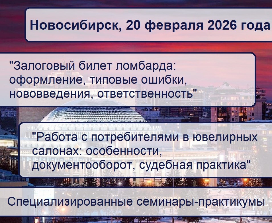 20 февраля 2026 года приглашаем собственников ювелирных магазинов и ломбардов в в Новосибирский Экспоцентр на специализированные практикумы: 📌 "Залоговый билет в ломбарде" На мероприятии рассмотрим вопросы: ▪️Особенности заполнения залогового билета; ▪️Типовые ошибки; ▪️Ответственность за нарушения требований; ▪️Электронный документооборот ломбардов (в части подписания договоров), возможность электронной подписи при заключении и продлении договора; ▪️Проекты и нововведения 2025–2026 гг. Стоимость участия: 3 500 руб. 📌 "Работа с потребителями в ювелирных салонах" На мероприятии рассмотрим вопросы: ▪️Нормативная база вопроса защиты прав потребителей ювелирных салонов, интернет-магазинов; ▪️Права потребителей и обязанности продавцов, особенности, связанные с оборотом драгоценных камней и драгоценных металлов. Особенности возврата ювелирных изделий, документооборот при возврате ювелирного интернет-магазина; ▪️Особенности рассмотрения потребительских претензий. Судебное разрешение ко