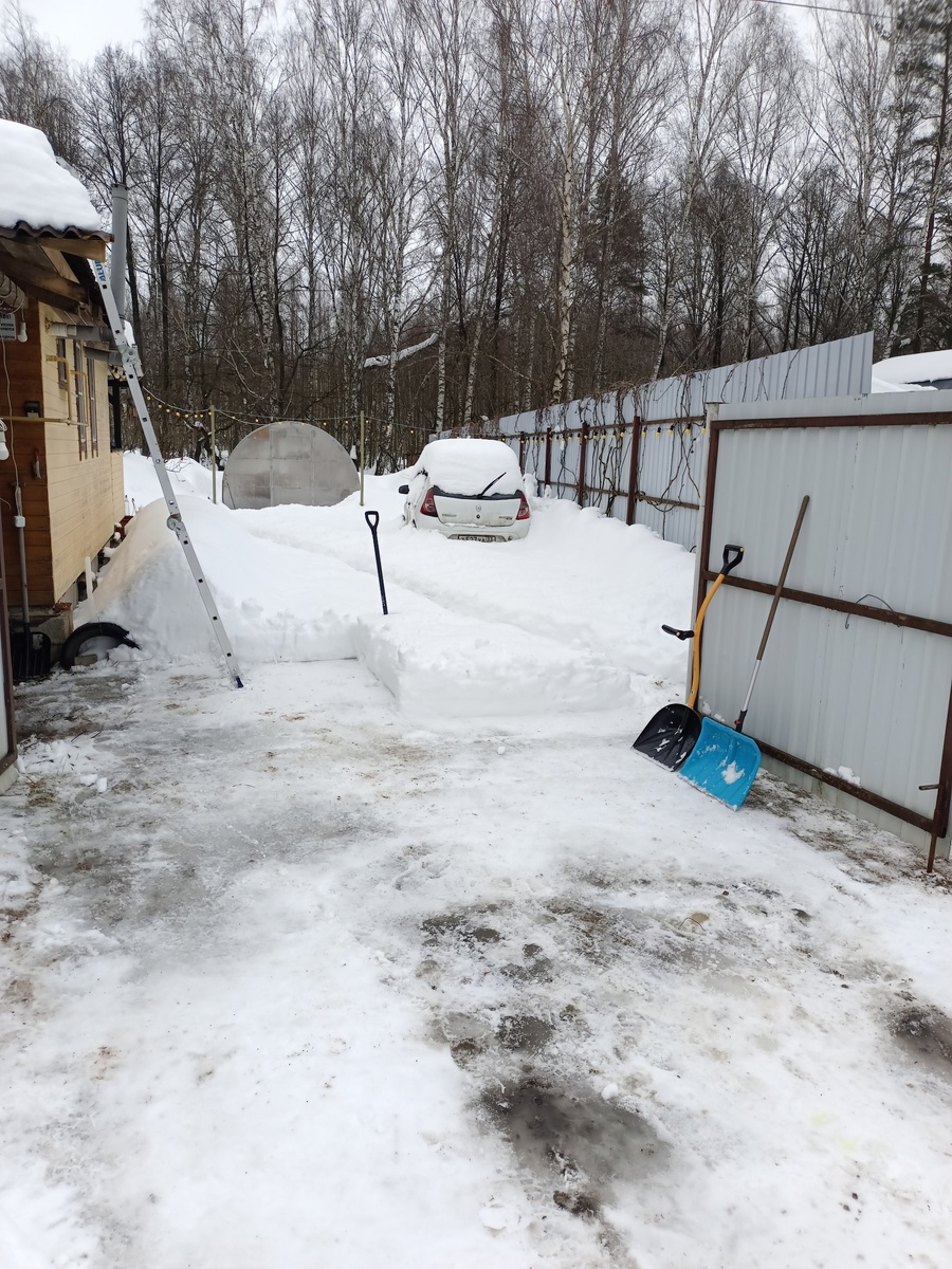 После вскрывать ворота. Отбить снаружи. Вытащить снег изнутри. Лишь после створки раскрывать. Ставлю лестницу, на крышу. Там очень критичная масса, которую нужно бы скинуть.