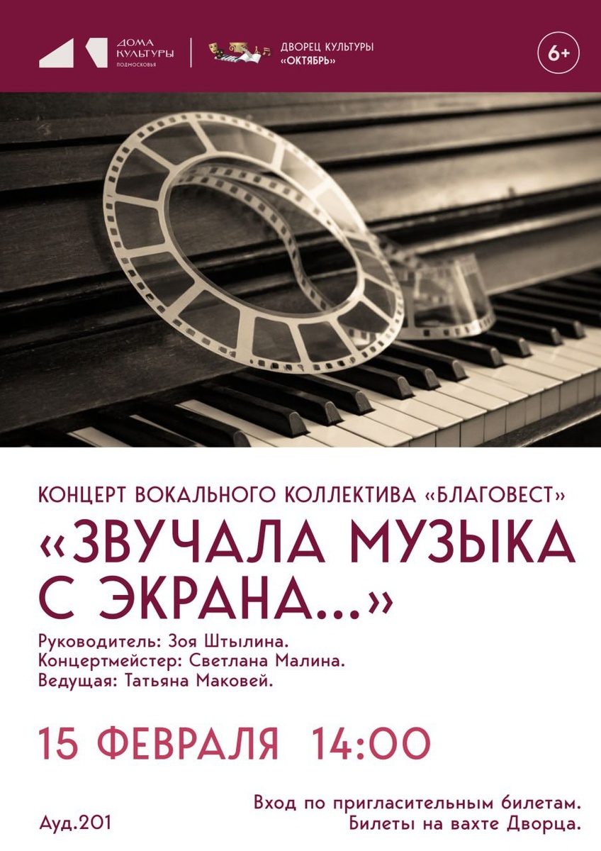 ✨ Концертная программа Вокального коллектива «Благовест» Прозвучат романсы и песни из отечественных фильмов. ➖Руководитель: Лауреат Международных конкурсов, обладатель Международной премии «Филантроп» - Зоя Штылина; ➖Концертмейстер: Лауреат Международных конкурсов - Светлана Малина; ➖Ведущая: Татьяна Маковей. 💘Вход по пригласительным билетам. Билеты на вахте ДК. Тел.: +7 (4967) 54-75-49 🚫 Возраст: 6+ 📆 15.02.2026 🕒 14:00 🏢 Дворец культуры «Октябрь» 📍 г. Подольск, ул. Свердлова, д.38 ⭐Поддержать канал голосом 🍰Где поесть в Подольске ✅ Мероприятия Подольск https://dzen.ru/id/66ed500f7b5671493eca3fd6 http://vk.com/podolsk_events http://dzen.ru/podolsk_events