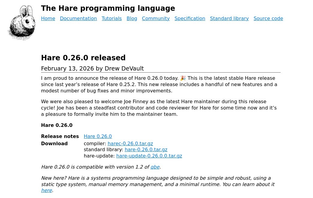 📝 Кратко: 13 февраля 2026 года состоялся релиз языка программирования Hare 0.26.0 от команды под руководством Дрю ДеВолта (создателя платформы SourceHut и mail-клиента Aerc). Выпуск Hare 0.24.0 состоялся в феврале 2024 года, релиз Hare 0.24.2 произошёл в июле 2024 года. В июне 2025 года вышел Hare 0.25.2. Читать далее 🔗 Читать оригинальную статью (ссылка) 📊 Источник: Habr ⏰ Время: 14.02.2026 05:06 📱 Другие каналы: 🪙 ВКрипту | 🎮 ВИгрухи | 🏎️ ВТачки | ✈️ ВТравелу #gadgets #гаджеты #технологии