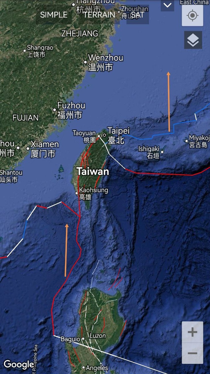 Рифтовая зона, охватывающая северо-запад Филиппинской плиты и часть Окинавской плиты вокруг Тайваня, согласно сегодняшнему ОСТИ продолжает демонстрировать потенциал для землетрясения с магнитудой до М7.2+/-0.2 в течение 14 дней. ===== The rift zone covering the northwest of the Philippine Plate and part of the Okinawa Plate around Taiwan, according to today's data, continues to demonstrate the potential for an earthquake with a magnitude up to M7.2+/-0.2 within 14 days.