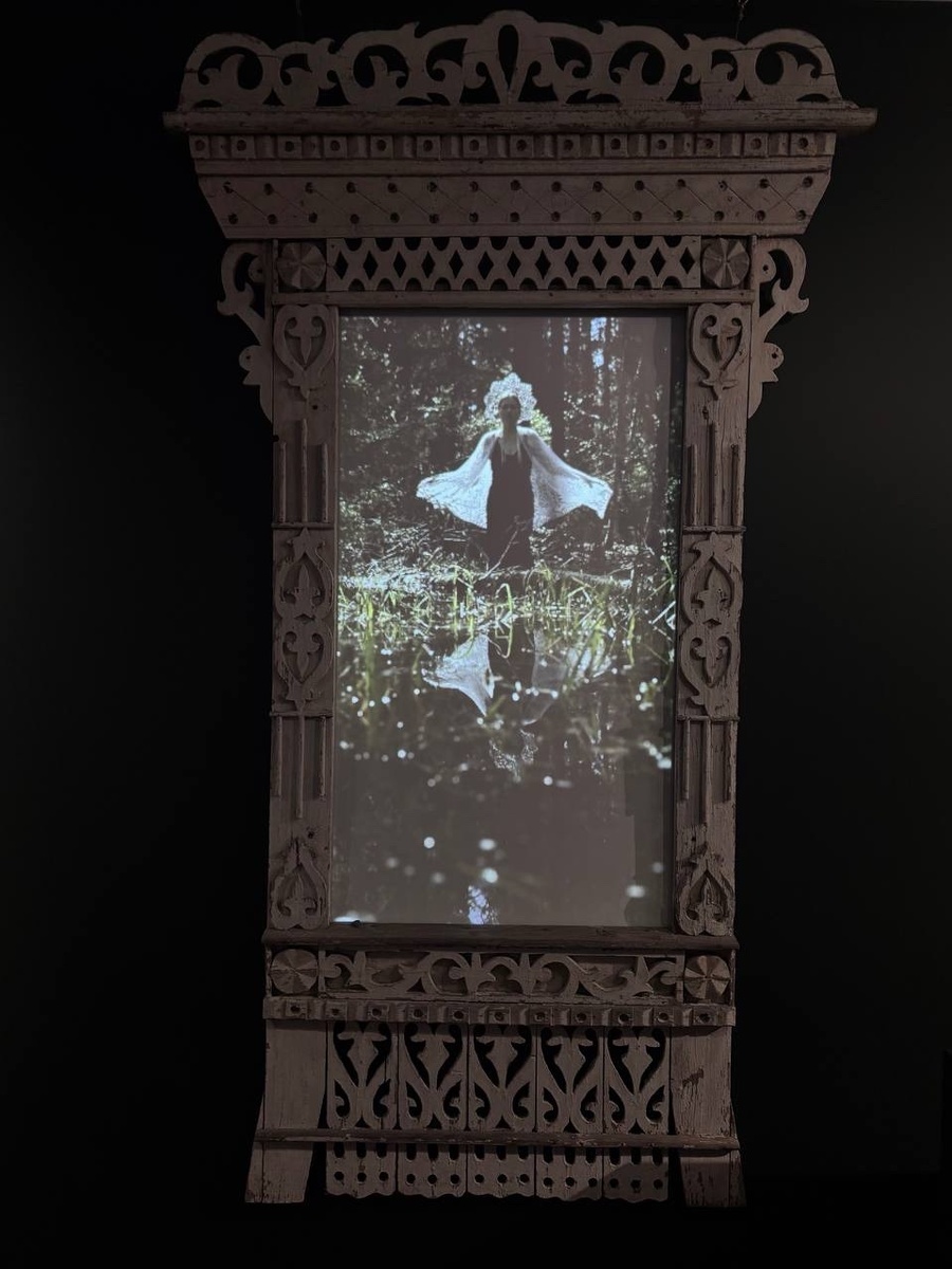 - По кураторской задумке видео обрамлено настоящими наличниками из Ивановской области начала XX века. Это не ретушь: это мост между городской авангардностью видео‑арта и глубокой провинциальной культурой. Наличник — традиционный «портал» в дом, защитный орнамент, который так органично перекликается с кокошником и нимбом.