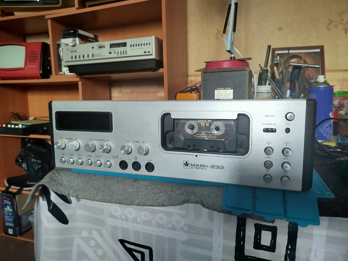 Вот жеж как бывает подумал я положив в багажник сей магнитофон, вот как бывает как пелось в песне, однако обо всё поподробнее. Так вот товарищи, прошло объявление о продаже кассетного легендарного магнитофона Маяк 232, списался с продавцом, сторговались до трёх тысяч, договорился о встрече. На второй день поехал по указанному адресу и купил его. Удивляет что его никто не купил в первый день, у нас такие аппараты куда в более грустном виде уходят под ремонта за 2-3000р только так. А тут и сохран то порадовал и не часто встречающаяся белая лицевая панель, да не ободранная как всегда бывает, а в хорошем состоянии. Ну так вот всё отмыл, электролиты заменил, пропаял, почистил да нанёс новую смазку, поставил пассик и аппарат ожил, правда перемотки ближе к концу кассеты уже не было, это втулки подкассетника полопались, есть пути решения с их заклейкой, я пока что не экспериментировал, да и клеить там уже было нечего ибо потрескались конкретно. Поставил от Кометы 225, но там они тоже не очень,