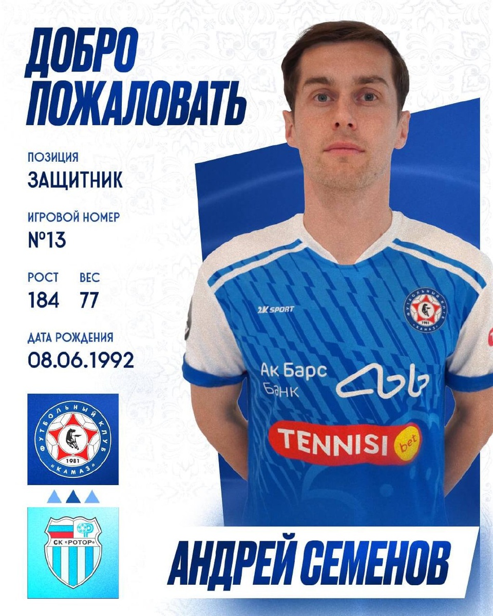 🚨 Защитник Андрей Семенов пополнил состав футбольного клуба «КАМАЗ».