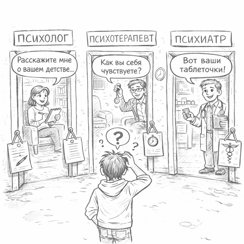 Из-за этого люди либо боятся «не того» специалиста, либо ждут от него невозможного. На самом деле это разные роли, с разной зоной ответственности. Психиатр Психиатр — врач. Он работает с психическими расстройствами как с медицинскими состояниями. Зона психиатра: Психиатр: Важно: обращение к психиатру — это не «конец» и не «приговор», а медицинская помощь. Психотерапевт Психотерапевт работает на стыке медицины и психологии. Это специалист по глубинным психическим процессам, а не только по симптомам. Зона психотерапии: Психотерапевтом может быть: Психотерапия — это не «поговорить»,