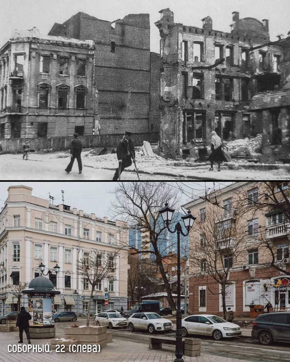 Она нанесла городу страшный ущерб. В руинах лежало 12 тысяч зданий, большая часть Большой Садовой и Буденновского, практически все главные здания центра. ⠀ Из 274 фабрик и заводов уцелело шесть. Оказались уничтожены все мосты, лежали в руинах театры, школы, музеи, больницы и другие общественные здания. В библиотеках сгорело свыше двух миллионов книг. Во время второй оккупации в городе погибло 40 тысяч человек, 53 тысячи угнали в рабство в Германию. ⠀ Для понимания масштабов боев в городе в июле 1942 года: тогда Ростов защищала 56 армия, полностью укомплектованная и закаленная. 25 июля, через шесть дней боев в городе и окрестностях, ее отправили в резерв на доукомплектование. ⠀ Из 120 тысяч человек в армии осталось 18 тысяч. О той битве почти нет упоминаний в советской печати — историкам приходится выискивать их в воспоминаниях и книгах немцев. ⠀ После войны Ростову грозила судьба Севастополя, Сталинграда и других разрушенных городов — снос исторической застройки и появление сталинских