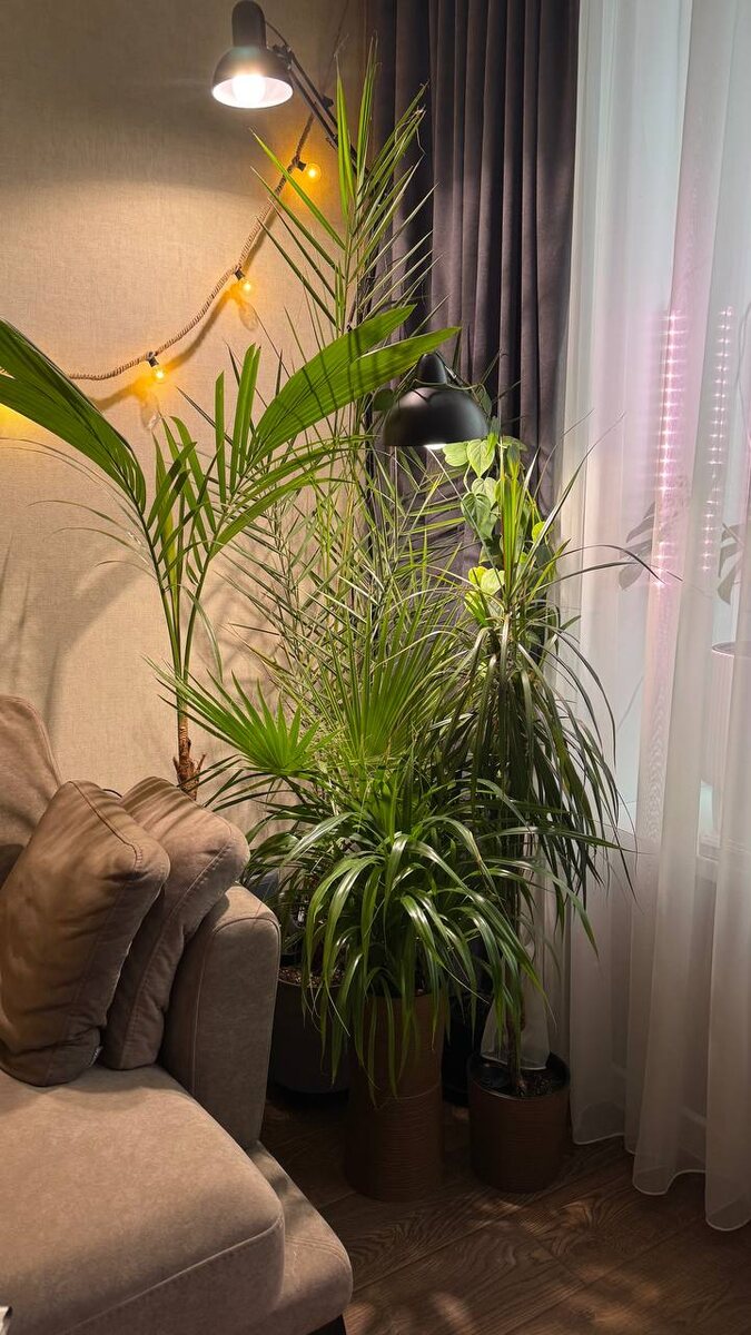 🌴 Здесь к меня живут: ➖Панданус (уже в новом доме, остался на фото на память) ➖Вашингтония нитчатая (я растила многого лет из семечки) ➖ Финиковая пальма (растила из косточки от финика) ➖Драцена (первое растение в коллекции, со мной около 10 лет) ➖ Кокос нуцифера (эксперимент по проращиванию кокосов не удался, пришлось пророщенный купить)) ➖Торшер с филодендроном бразил Yu_jungle 🌱