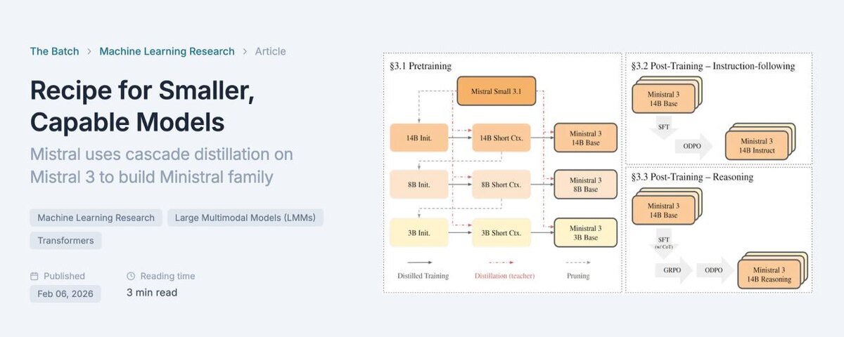 Mistral AI представила семейство Ministral - компактные модели, созданные с помощью подхода cascade distillation. - Большая модель Mistral 3 выступает в роли «учителя» - Дистилляция проходит в несколько этапов, а не за один раз - Каждая следующая модель учится на результатах предыдущей - Быстрее inference - Дешевле запуск в продакшене - Подходит для edge-устройств и локального запуска - Можно масштабировать AI-сервисы без огромных затрат - В итоге - меньше размер, ниже стоимость, высокая точность Большие модели будут использоваться для обучения… а в продакшене будут работать маленькие и эффективные. https://www.deeplearning.ai/the-batch/mistral-uses-cascade-distillation-on-mistral-3-to-build-ministral-family #ai #ml #llm #Mistral