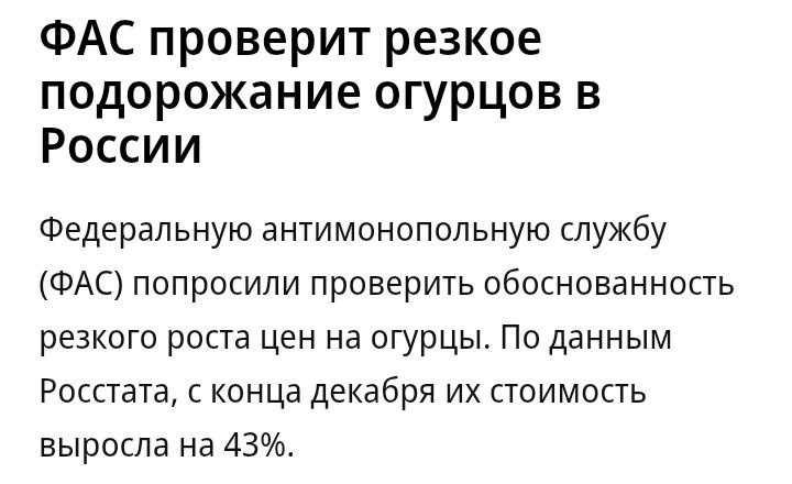 ФАС проверит огурцы на предмет подорожания, в магазинах и на рынках цена достигла 500 - 900 рублей за килограмм, пишут СМИ
