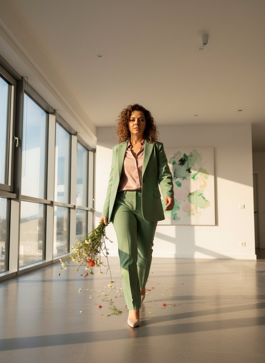 🎨 Промпт: A portrait of the woman from the reference photo, her facial features and likeness unchanged, captured in a fierce, determined stride across a vast, modern minimalist apartment during golden hour. Warm, natural sunlight streams through panoramic windows, creating long exposure motion trails that blur her decisive movement. She wears a sharp, tailored business suit in fresh spring green with a silk pink blouse, holding a loose bouquet of wildflowers whose petals trail softly. The minimalist space features clean lines, a neutral backdrop, and subtle hints of green and pink in abstract wall art. Editorial high fashion photography, elegant and glamorous, shot from a dynamic low angle to emphasize power and motion. Банк Промптов | Твои Идеи