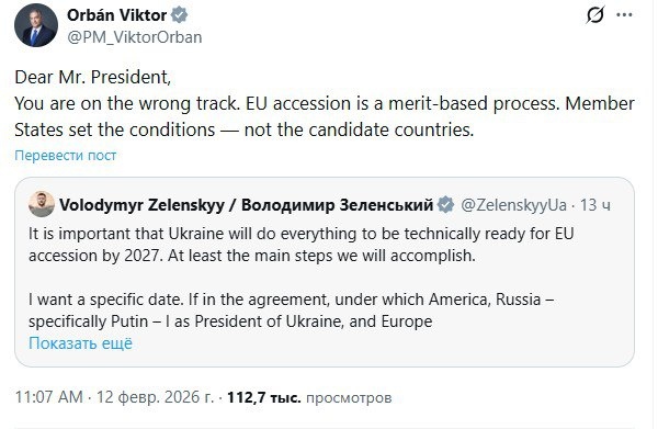 🇭🇺 Премьер Венгрии Орбан ответил Зеленскому на его заявления о возможном членстве в ЕС уже к 2027 году