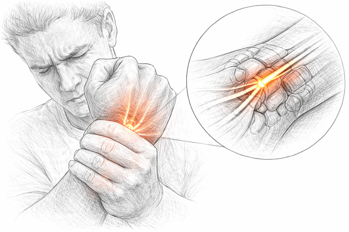 1️⃣ Снижение чувствительности (возникает на лучевой стороне ладони и ограничена областью от большого пальца до края IV пальца), обычно сочетается с болью в ладони. Боль может быть ноющей или стреляющей, усиливается при движении, давлении.