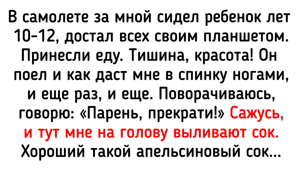 В самолете за мной сидел ребенок лет 10-12, достал всех своим планшетом. Принесли еду. Тишина, красота! Он поел и как даст мне в спинку ногами, и еще раз, и еще. Поворачиваюсь, говорю: «Парень, прекрати!» Сажусь, и тут мне на голову выливают сок. Хороший сок апельсиновый. Но его мало, поэтому у меня только голова и ворот майки мокрые. Я встаю и как вылью на парня свою бутылку воды 0,5 литра. Крики, оры, проклятия, пацан сидит с мокрыми от воды штанами. Бортпроводница попросила прекратить конфликт. Остальная часть полета прошла в тишине и без пинков. После посадки все трое пулей бежали из самолета. А в аэропорту меня встречал отец семейства, который жаждал или денег, или возмездия. Вел он себя так, что в итоге его забрала полиция аэропорта. © zaharius.e70 / Pikabu