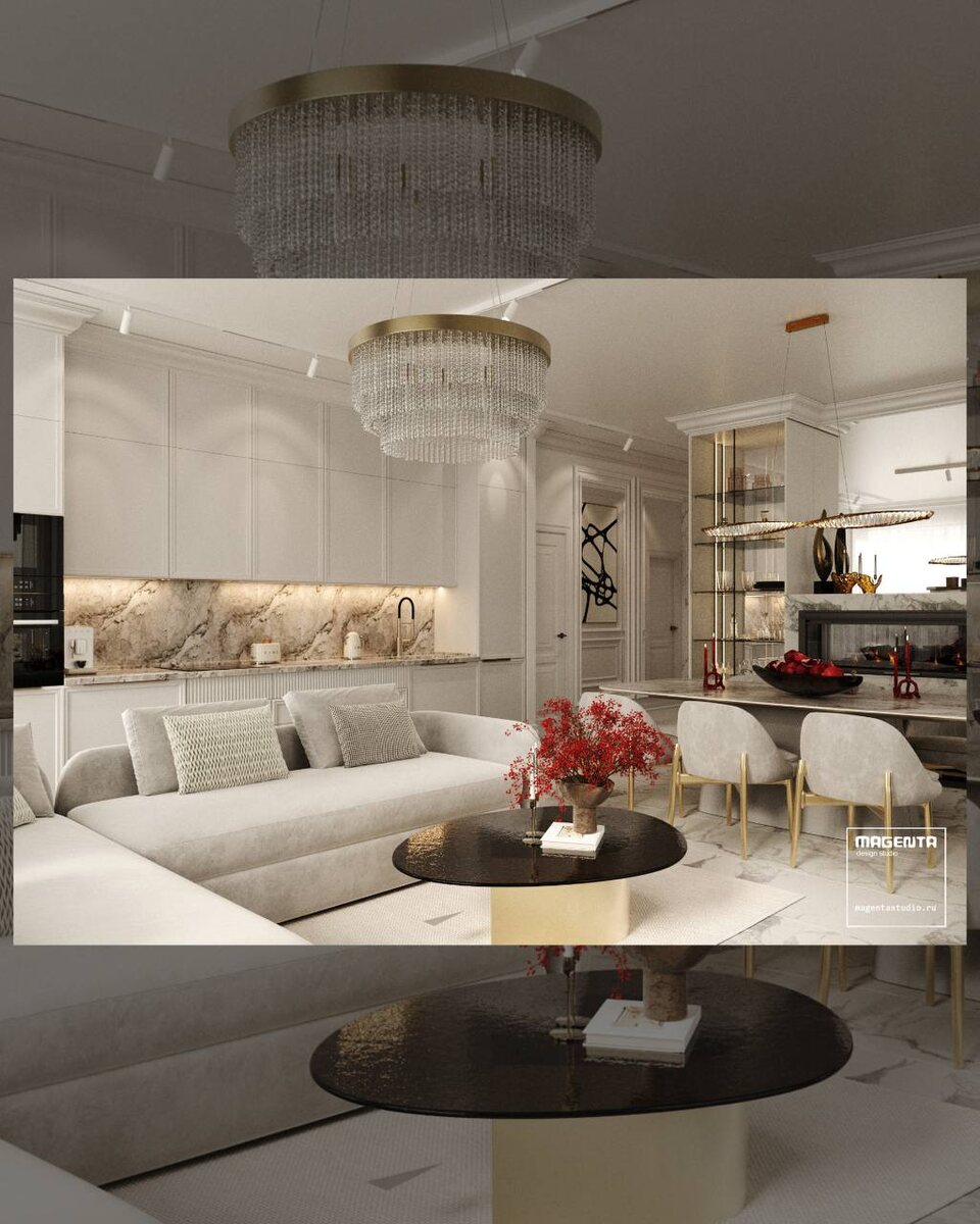 грамотная архитектура: Клиент обратился с запросом на светлый неоклассический интерьер. Кухня-гостиная выполнена в угловом варианте, что максимально использует четыре большие панорамные окна. Из гостиной открывается вид на храм и реку Амур. Интерьер выдержан в современной неоклассике с лёгкой, воздушной атмосферой: светлая палитра, изящные молдинги, натуральные материалы и золотые акценты подчёркивают утончённость пространства, наполняя его светом и комфортом. Прикоснитесь к дизайну класса А - портфолио реализованных проектов: magentastudio.ru Magenta