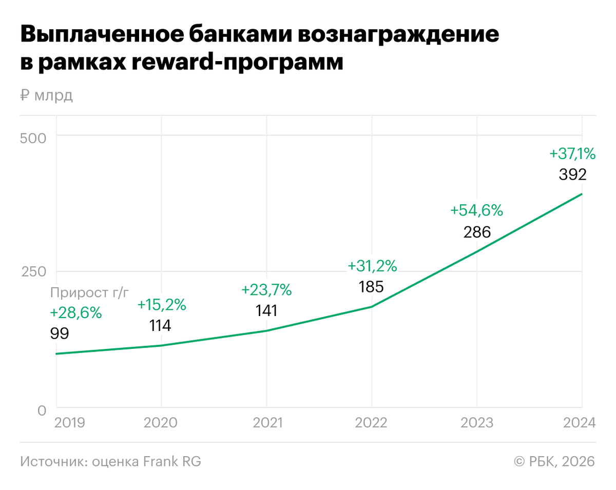 Так, если в 2019 году банки выплатили по кешбэкам ₽99 млрд, то в 2021 году — уже ₽141 млрд, а в 2024 году — ₽392 млрд.